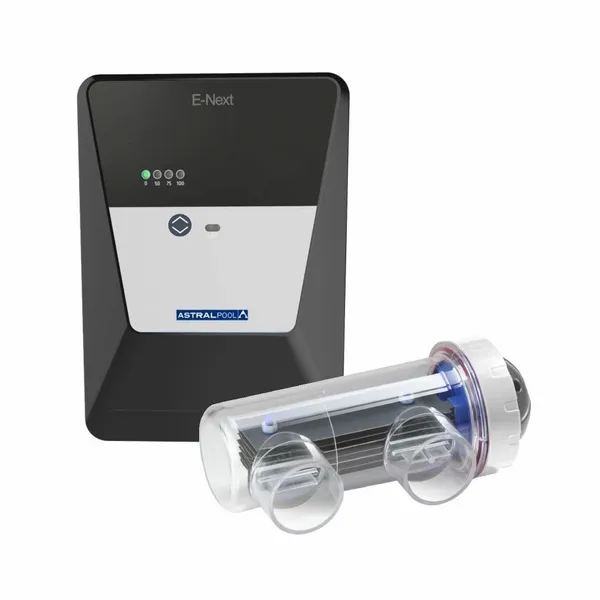 De Astral E-Next is een zoutelektrolyse van de nieuwste generatie. Speciaal ontwikkeld door Astral als instapmodel voor permanente inbouw- of opbouwzwembaden tot 30m3. Deze zoutelektrolyse is zeer eenvoudig én effectief in gebruik en maakt het mogelijk automatisch chloor aan te maken. De zoutproductie is instelbaar op vier standen: 0, 50, 75 en 100%. Als het systeem ingesteld wordt op 100% is de productie 7 gram per uur.