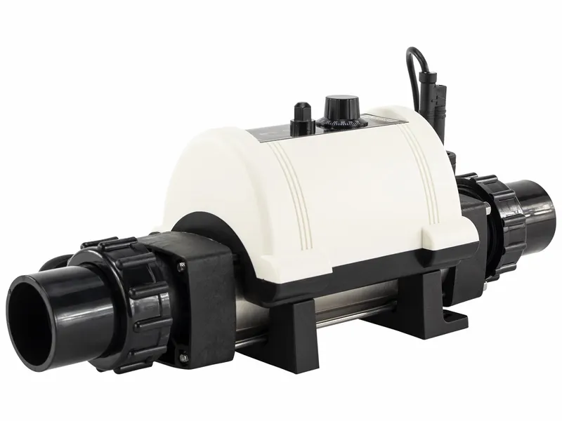 Aan de bovenzijde vind je een thermosstaatknop waarmee je de gewenste temperatuur van het water in kunt stellen tot maximaal 40 graden. De Electro Nano PRO wordt geleverd met een 1,5″ (38mm) en een 50mm aansluiting. Daarmee is het ook een heel handige verwarming voor een Intex of Bestway zwembad.